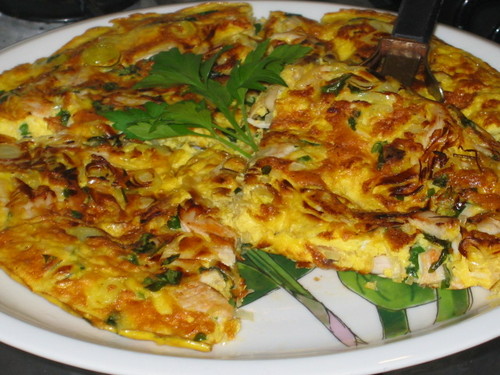 Numa taça batem-se os ovos e o leite. Adicionam-se à frigideira e deixam-se cozinhar por 5 minutos. Vira-se o pastelão para que frite também do outro lado mais 3 minutos.