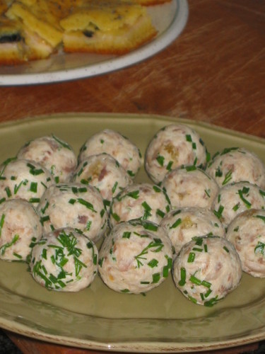 Esmagar o peixe e misturar o queijo, pão ralado, a salsa picada e as passas cortadas em bocadinhos pequeninos. Temperar com sal e pimenta e moldar bolinhas que se passam por uma mistura de cebolinho e endro picados.