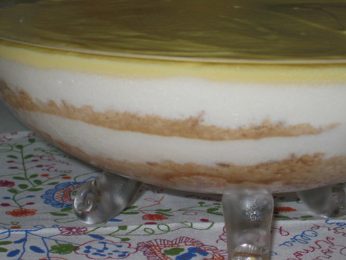 Bater as claras em castelo firme. Adicionar quatro colheres de sopa de açúcar e continuar a bater até estar com a consistência de suspiro. Incorporar as claras nas natas batidas. Deitar esta mistura sobre as bolachas e levar ao frigorífico.