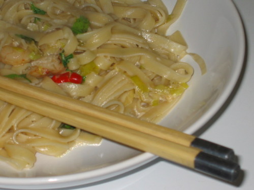 Juntar os temperos, a água e o camarão e deixar ferver por cerca de 5 minutos. Adicionar as natas e mexer até engrossar.
