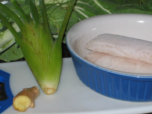No fundo de um tacho põe-se a cebola cortada em meias luas, o funcho cortado em meias luas, o gengibre em rodelas e as cascas de limão.