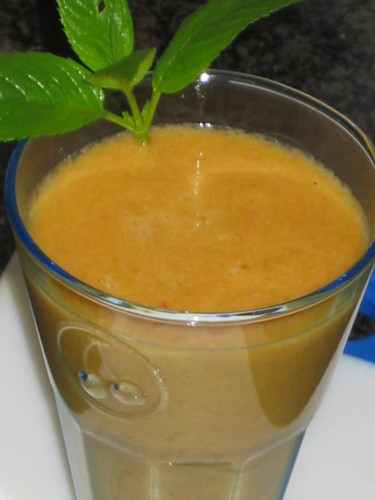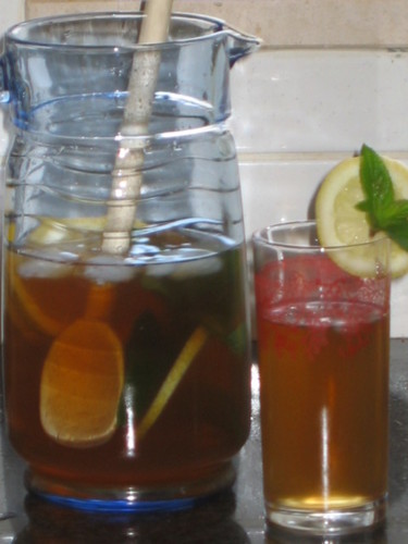 Numa taça grande junta-se o açúcar com os pêssegos e as folhas de Lúcia-Lima. Deixa-se macerar por algumas horas.