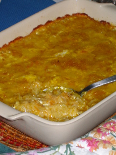 Deita-se a massa num tabuleiro untado (forrei o meu com papel de ir ao forno e não untei) e leva-se a forno médio por cerca de 20 a 25 minutos. Quando estiver dourado retira-se do forno e desenforma-se para uma rede para arrefecer.