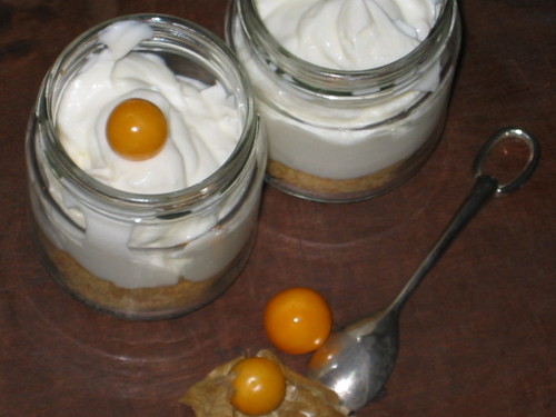 Dividem-se os ingredientes por quatro copos, taças ou frascos começando com a bolacha ralada, por cima as fisális e por cima o creme de requeijão.