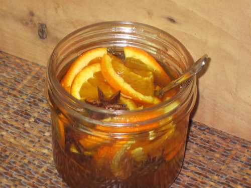 Num frasco põem-se as fatias de laranja e as estrelas de anis. Por cima deita-se o mel e mexe-se bem com uma colher para envolver.