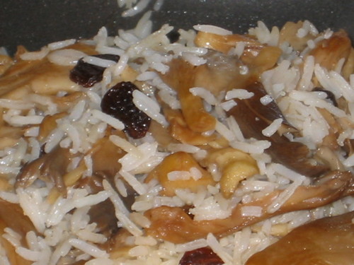 Saltear os cogumelos com os dentes de alho em azeite. Temperar a gosto, com sal e pimenta ou com alguma mistura de sal aromatizado. Quando estiverem prontos (cerca de 8 minutos é suficiente) junta-se o arroz cozido e as passas e envolve-se bem até aquecer um pouco.