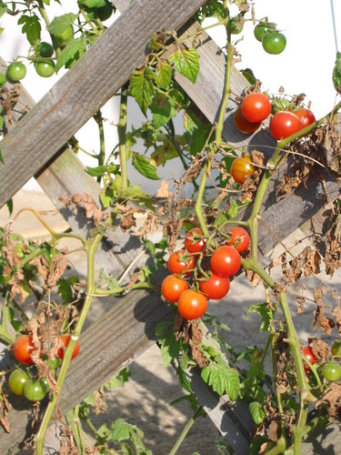 Todos os anos os tomates cereja nascem espontaneamente na minha horta e dão, dão, dão que se fartam, sendo neste momento a única planta que ainda produz alguma coisa.
