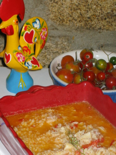 Adicionar o tomate aos bocados e o arroz e mexer bem. Ajustar os temperos e ir adicionando água (de cozer a pele e as espinhas).