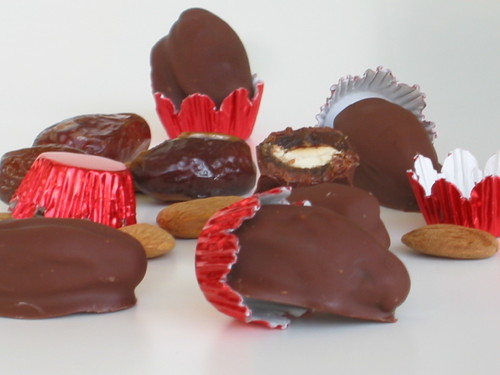 Derreter o chocolate no micro-ondas por cerca de 1 minuto. Mexer bem e com a ajuda de um ou dois garfos, envolver as tâmaras no chocolate derretido.