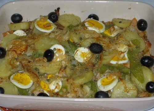 Num tabuleiro deitam-se umas colheres de cebolada, por cima põe-se uma camada de batatas, ervilhas e ovos. Sobre esta camada põem-se as lascas do bacalhau e tempera-se de pimenta fresca. Mais uma camada de cebolada e novamente batatas, ervilhas e ovos. Por cima põe-se a restante cebolada e enfeita-se com azeitonas. Volta-se a polvilhar com pimenta.