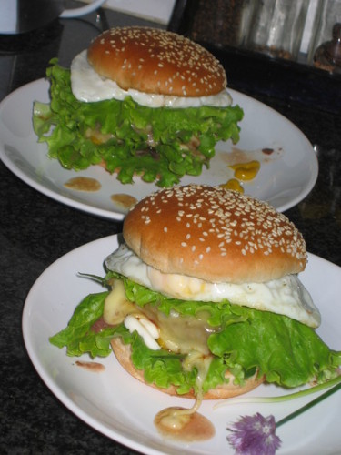 Sobre a base põe-se um bocadinho de maionese e de mostarda, por cima alface, cornichons, mais um bocadinho de maionese e mostarda, o hamburguer com o queijo (entretanto derretido), a rúcula, o ovo, pimenta fresca e por cima a tampa do hamburguer (a parte que tem as sementes de sésamo, para os distraídos...)