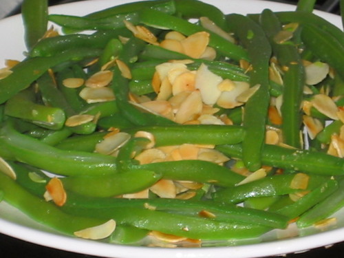 Na mesma frigideira derrete-se a colher da manteiga, adicionam-se as vagens e as amêndoas e envolve-se bem.