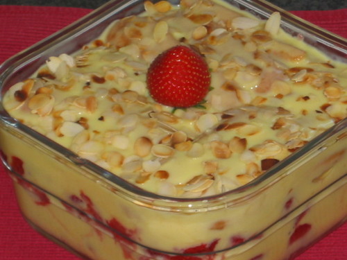 Numa taça ou forma de vidro põe-se um pouco do creme de custarda no fundo. Por cima põem-se biscoitos de champanhe. Sobre os biscoitos, os morangos às rodelas. Novamente por esta ordem até se acabarem os ingredientes. A última camada é de creme de custarda. No final deve-se polvilhar com a amêndoa tostada.