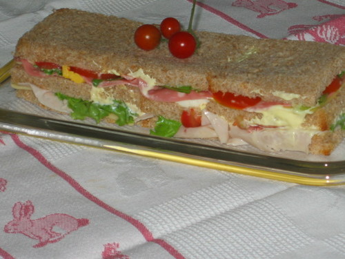 Nova camada de fatias de pão barradas com a mistura de maionese e mostarda. Por cima fatias de fiambre de peru, queijo, alface e tomate. Uff, cansativo…