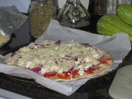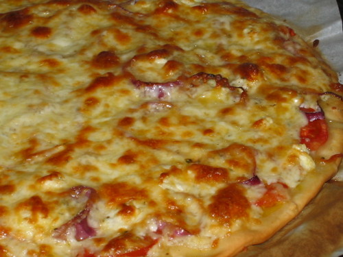 Sobre a base da pizza verte-se um fio de azeite. Por cima põe-se as rodelas de tomate bem maduro, retirar o máximo de sementes. Polvilhar as rodelas de tomate com orégãos e por cima dispor rodelas de cebola roxa e queijo feta esfarelado. Por cima de tudo cobre-se com queijo mozzarela e leva-se a forno médio por 20 minutos ou até estar bem douradinho.