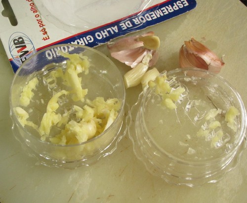 Metem-se os alhos descascados lá dentro, roda-se e ficam logo esmigalhadinhos. Uma maravilha!