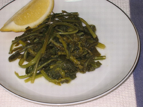 Na realidade, chama-se Horta (digo eu em grego) e é uma mistura de ervas cozidas que depois são temperadas com azeite do bom e sumo de limão. Comem-se quentes ou frias e são mesmo saborosas.